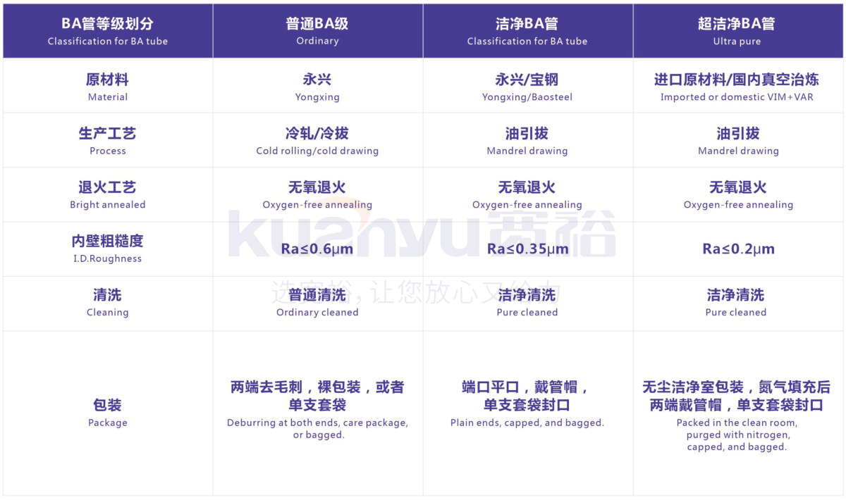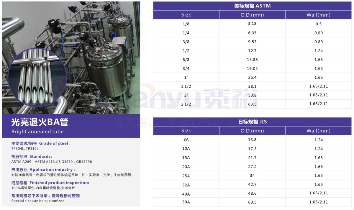 應(yīng)用領(lǐng)域:不銹鋼光亮退火B(yǎng)A管, 醫(yī)療脫脂不銹鋼管,不銹鋼BA級(jí)管,不銹鋼潔凈級(jí)管,符合美標(biāo)規(guī)格ASTM、日標(biāo)規(guī)格JIS。