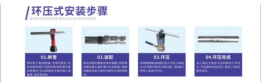安裝時(shí)先將寬帶密封圈套在管材端部插入管件的承口通過(guò)專(zhuān)用工具擠壓管件的密封段使其端部下凹嵌入管材,如同絲扣相互咬合強(qiáng)力鎖緊;擠壓過(guò)程中密封腔里的橡膠材料會(huì)因承受壓力而蠕動(dòng)直至填滿(mǎn)整個(gè)腔體進(jìn)而實(shí)現(xiàn)可靠密封。