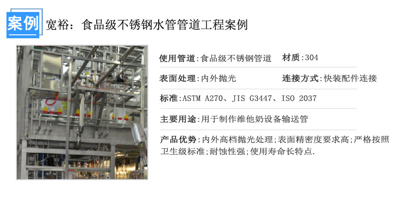 而這次寬裕的合作伙伴佛山維他奶也是采用寬裕衛(wèi)生級(jí)不銹鋼管,衛(wèi)生級(jí)(食品級(jí))不銹鋼管在制藥、食品、啤酒、飲用水、生物工程、化學(xué)工程、空氣凈化、航空、核工業(yè) 等國(guó)民經(jīng)濟(jì)建設(shè)多領(lǐng)域多行業(yè)上廣泛地應(yīng)用,每年有大量的進(jìn)口。這里介紹本廠生產(chǎn)衛(wèi)生級(jí)(食品級(jí))不銹鋼管的工藝與設(shè)備、管的性能與質(zhì)量。